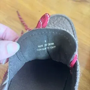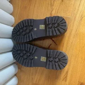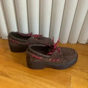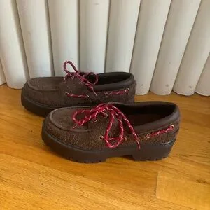 Jeffrey Campbell crushed lug sole platform boat shoe loafer. Red and white shoe laces tall platform loafer. This boat shoe was so cute but sized up too far. These are a 9, my 8.5 foot kept slipping out . So cute but don’t fit. Worn twice