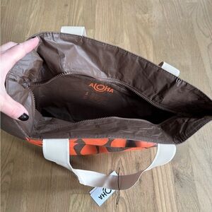- Brownish color with decorative orange shape tote bag and small matching pouch