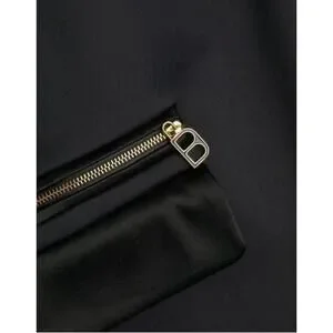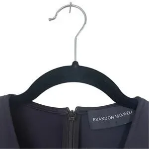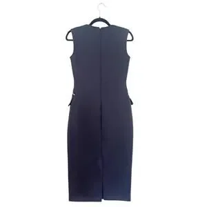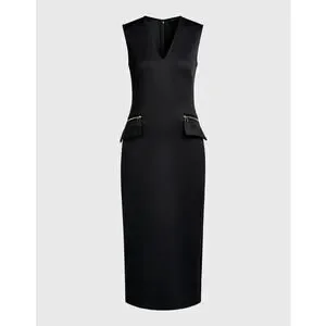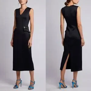 Chic and modern Brandon Maxwell sleeveless midi sheath dress in a structured black neoprene fabric. Features a sharp V-neckline, clean tailored lines, and signature gold-tone zip pockets at the waist for a flattering, sculpted silhouette. Style-ready for cocktail events, evening dinners, work functions, or red carpet-level moments.