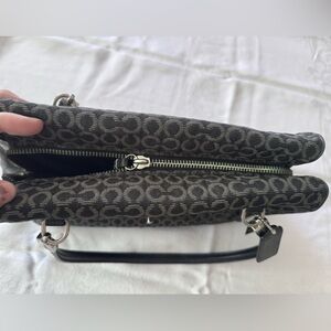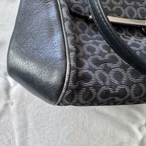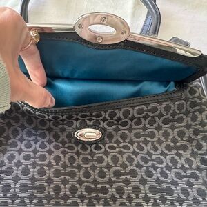 Stylish Coach satchel with signature pattern. Features sleek black leather accents. Perfect for everyday elegance. Petite style with turquoise satin lining. Elegant appearance. Small wear marks on the four corners of the bag from use. Small discoloration on the back from use. Authentic Coach bag (included serial#).