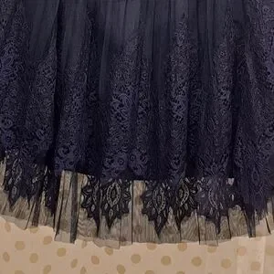 Elegant navy A-line skirt with intricate lace detailing. Perfect for a sophisticated look.