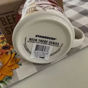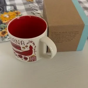 Indiana-themed Starbucks mug with red interior. Features iconic state illustrations.