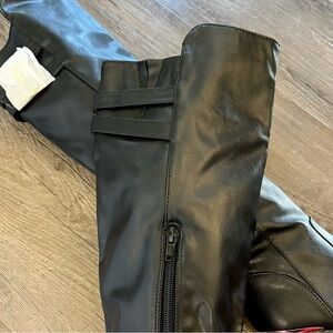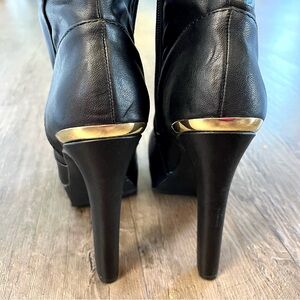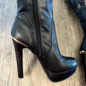 NWT Material Girl MRozie Black Over the Knee Boots. Size 7 and size 10 available. Stunning and sexy all black stiletto boots. Rounded toe. Gold metal detail at the heel. Side zip closure from ankle to knee. Comes with original box. Was originally sold at Macy’s.