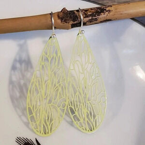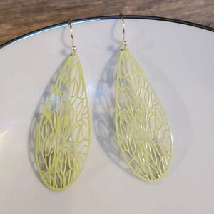 Art Nouveau Lacy Yellow Green Filigree Slim Teardrop Enamel Pendant Earrings