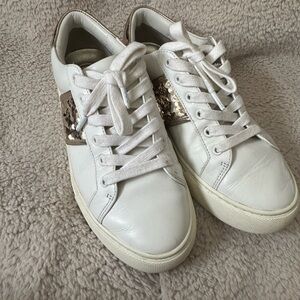 Elegant sneakers with white leather and gold sequin accents. Perfect for a stylish casual look.