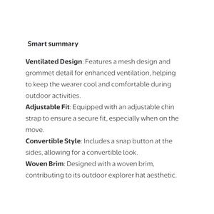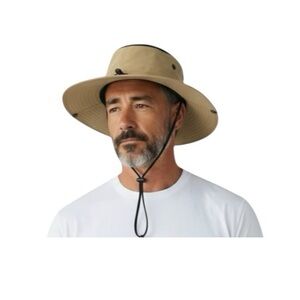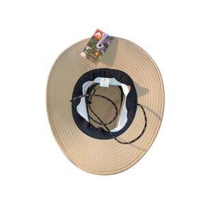 Stylish tan hat with wide brim. Perfect for outdoor adventures. Includes adjustable chin strap.