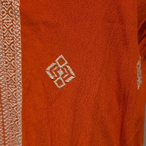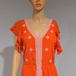 Bright orange midi dress with pink detailing. Features a V-neck and ruffle sleeves. Perfect for casual outings.