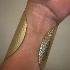 Elegant gold hammered cuff bracelet featuring a sparkling stone centerpiece. Perfect for adding a touch of glamour.
