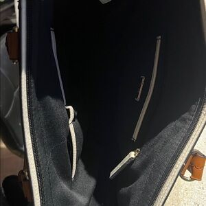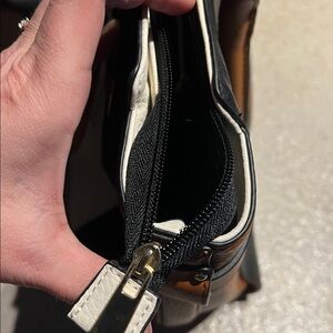 Stylish and versatile women's tote bag in black and brown. Perfect for everyday use with a chic design. Size is 14 inches across and about 10.5 inches high. Strap still in original wrapping and plastic still on zipper pull inside. Like new