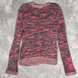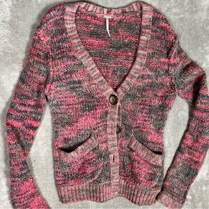Description- pink and gray chunky knit. Oversized buttons. Pockets. V-neck.