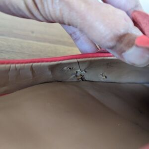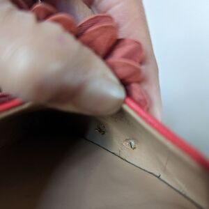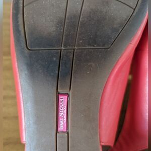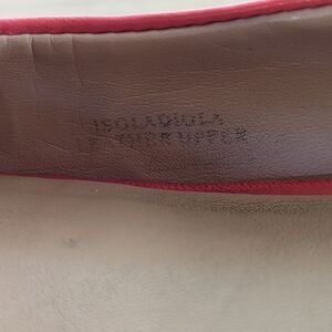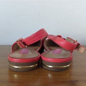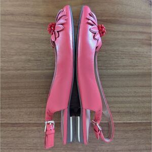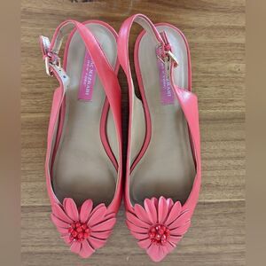 Description: Isaac Mizrahi Red Coral Floral Jewel Embellished Pointy Toe Slingbacks, sz 7, soft leather upper, beautiful daisy petals made out of cut leather and jeweled flower center, gold accent around the heel, some wear in the interior, photos included, and on the soles but overall in great condition, ships without box