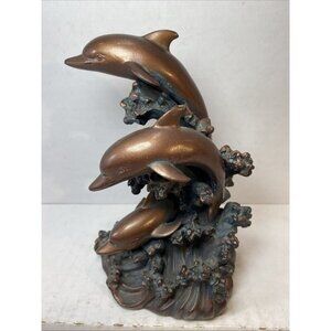 Dolphins Riding Waves Statue Figurine Brown/ Copper Resin Home Decor