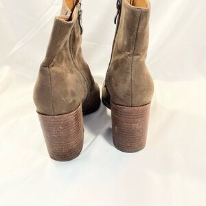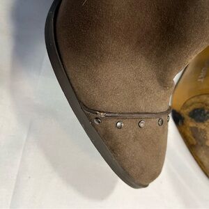 Report “JAEL” brown 2.5” chunky heeled bootie. Embellishments around front of bootie and up the side with an inside zip close. A couple of issues- see pics. These booties still have a lot of walking to do!