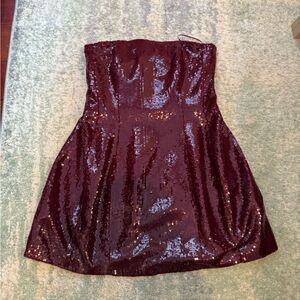 Shimmer in style with this elegant sequin strapless dress from Zara. It is brand new with tags! Perfect for any occasion, this burgundy piece adds a touch of glamour to your wardrobe. Size large and has a built in corset at the top to snatch you in. Message for questions 🥰