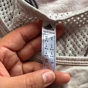 Cream tank top with breathable mesh design. Features Adidas branding.