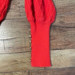 Chic red blouse with textured design. Features stylish button details on cuffs. Perfect for any occasion.