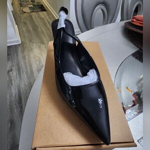 Step out in style with these elegant black slingback heels. Perfect for any occasion, they offer both comfort and sophistication .Black shiny heels with a sleek slingback design. Perfect for adding a touch of elegance. Brand new and have never been worn .