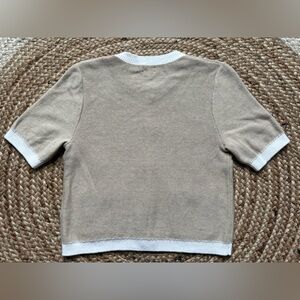 Description: Super soft 100% cotton J.Crew short sleeve cardigan in a warm sand beige with ivory contrast trim. Classic crew neckline, button front, and front patch pockets with button detail. The shorter length makes it perfect with high-rise jeans, trousers, or skirts.