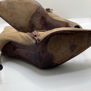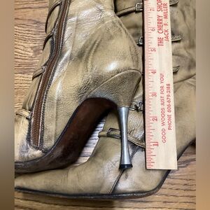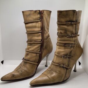 Beautiful distressed brown leather with a sharp pointed toe, slim stiletto heel, and distinctive multi-strap buckle detailing. A high-fashion, couture-style boot. Gently worn vintage condition, with front sole showing the most wear