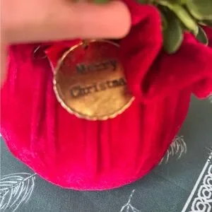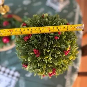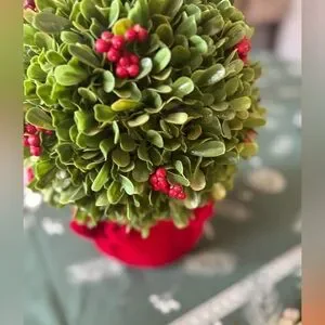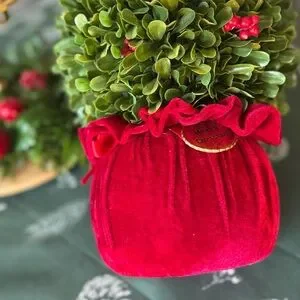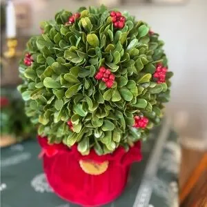 Brighten your home with this festive green and red holiday topiary. Perfect for adding a touch of holiday cheer to any room. Christmas bush decor centerpiece isolated on white background. Boxwood Sphere Arrangement. Red velvet pot.
