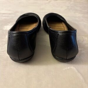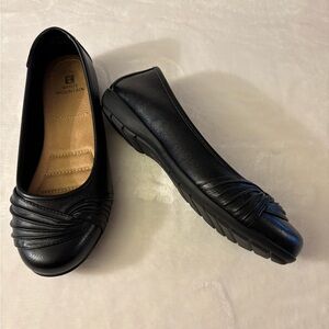 Elegant black flats with a gathered front. Perfect for daily wear. Size 7M. Like new condition. See pictures for sizes and details. Comes from a smoke free and pet free home.