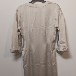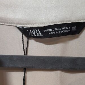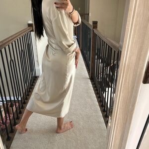 Experience the luxurious feel of this Zara cream robe, crafted from a smooth satin fabric that drapes beautifully. Featuring a classic wrap-style design with a tie waist, this robe offers a flowing silhouette perfect for relaxation. Its elegant simplicity makes it an ideal choice for special occasions or everyday comfort.