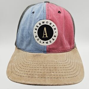 VINTAGE | Ashworth Golfwear suede colourbock adjustable cap hat. There are signs of vintage wear and tear including some discolouration on the interior as well as some of the boning of the hat structure poking through (see photos for details). Otherwise good pre-owned vintage condition.