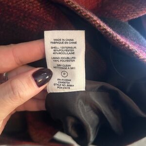 Avec Les Filles plaid double breasted pea coat. Red/black plaid called ‘Fall Foliage Plaid’. Size XXL. Polyester/Wool. Style # 80964.