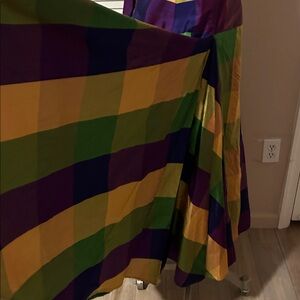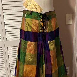 Vibrant plaid skirt featuring a mix of purple, green, and yellow. Perfect for adding a pop of color to your wardrobe.