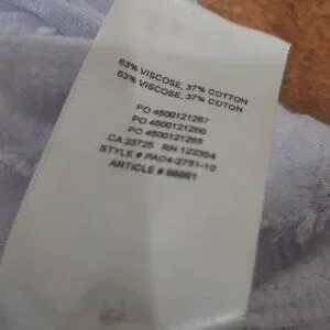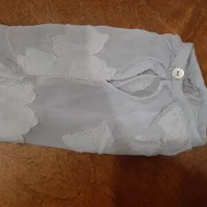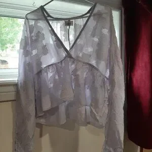 This blouse is a peplum style blouse made of a sheer material with delicate appliques embroidered on top. The appliques have a distressed look (see photos) and it has a very bohemian kind of look. It's a light lavender colour and looks stunning when the light shines through the sheer and embroidered details. Very cute with bralette underneath or over a dress! There are a few imperfections which I took photos of, but they are barely noticeable and blend in with the distressed style. Stock photo shows the same style/ fit but the appliques are slightly different in the one I have listed.