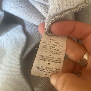 Classic gray champion hoody with a small blue embroidered logo on the chest. This is the hoody with the black lined hood. Nice deep size hood. General wash wear from laundering like light piling.