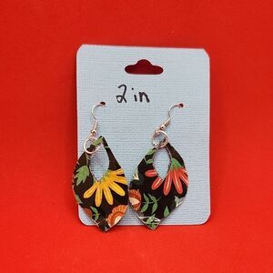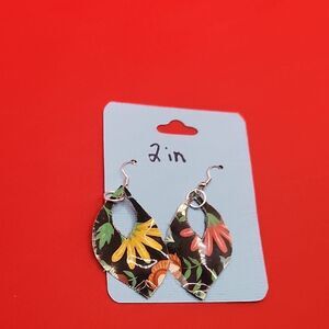 Add a touch of elegance with these floral drop earrings. Featuring vibrant colors, they are perfect for any occasion. These earrings feature a striking black and green color palette, designed to make a bold statement. Crafted with a modern artistic flair, they are perfect for adding a touch of creativity to any outfit. Lightweight and stylish, these earrings are a must-have for any jewelry collection. They are 2 inches long. Made of faux leather. They have a stunning floral design on them. They are one of a kind handmade items.