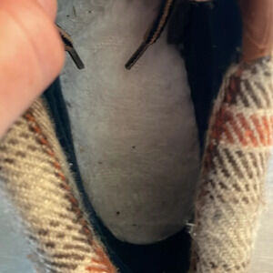 Color: tan leather, brown plaid opening, dark blue/black rubber
