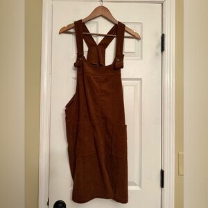 Stylish brown corduroy overall dress. Purchased from a boutique. No tag. Features front pockets and adjustable straps. White shirt is not included.