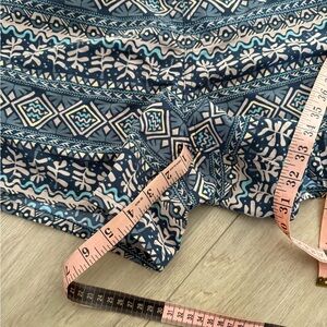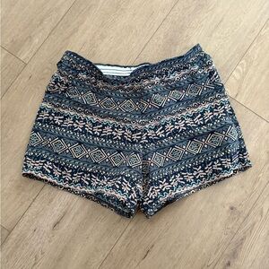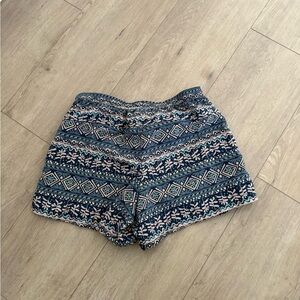 Chic high waist shorts with intricate patterns. Features blue and cream tones. Ideal for casual wear.