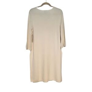 Discover effortless elegance with this Chico's Travelers Modern Ecru Tunic Sweater dress. The V-neckline flatters your décolletage, while the long sleeves offer a chic silhouette. Crafted with a subtle rib detail, this dress drapes beautifully, creating a polished and comfortable look. Side slits add a touch of modern sophistication and ease of movement. Perfect for a stylish day at the office or a relaxed yet refined brunch.