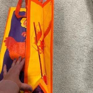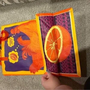 The product is a rare reusable shopping bag from Trader Joe's featuring an orange chicken design.with a unique and eye-catching orange color. It is a practical and environmentally-friendly alternative to single-use plastic bags, perfect for carrying items while shopping. The bag is a must-have for fans of Trader Joe's and collectors of unique shopping bags.