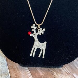 This elegant gold necklace features a charming reindeer pendant, perfect for adding a festive touch to any outfit. The delicate design and sparkling accents make it a standout piece for any occasion.