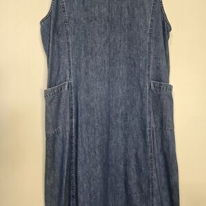 Keywords: Vintage Dress, Denim Dress, Jumper Dress, Overall Dress, Cottagecore, Homesteading, Prairie, Blue Denim, Sleeveless, Crew Neck, Maxi Dress, 100% Cotton, Utility, Casual, Size P, Petite.