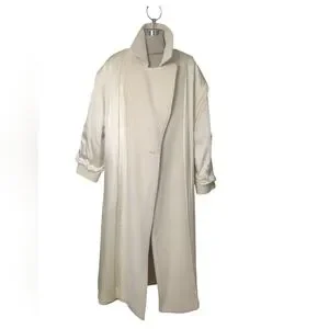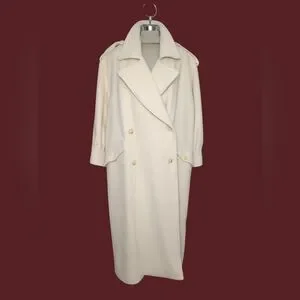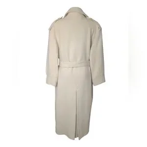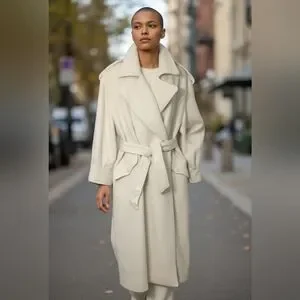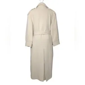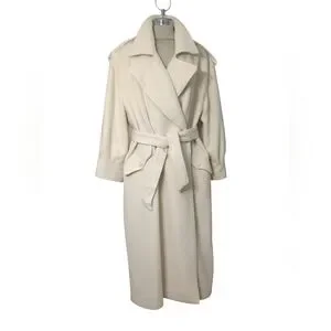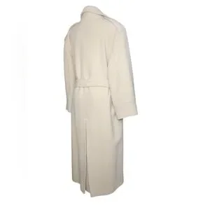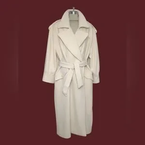 Elegant cream coat with a belted waist. Features wide lapels and buttoned cuffs. Perfect for a sophisticated look.