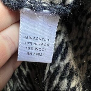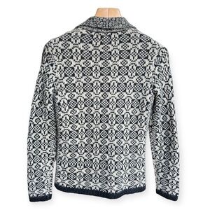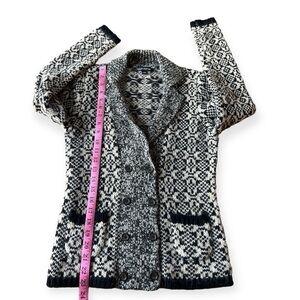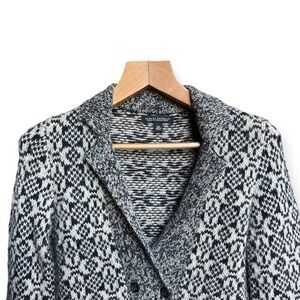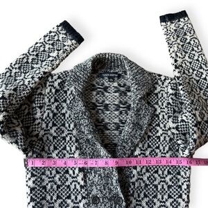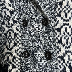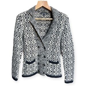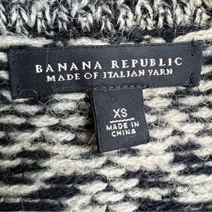 Women’s size XS navy blue and cream cardigan sweater by Banana Republic. Double breasted button closure in the front with collared neckline. Acrylic, alpaca and wool blend made of Italian Yarn. In excellent pre-owned condition. Measurements shown in photos.