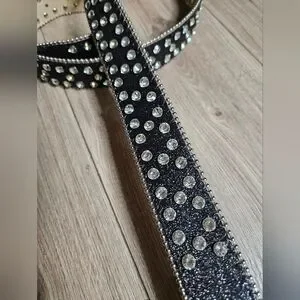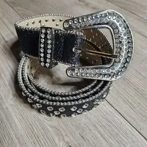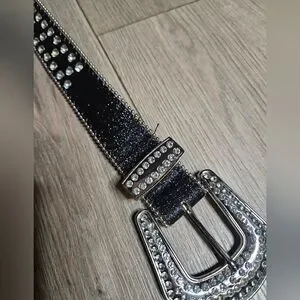 Stylish black belt with sparkling silver rhinestones. Features a large decorative buckle. Perfect for adding glam to any outfit.