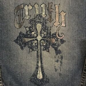 This YMI Short Denim Jean Jacket with Cross Size Medium is so adorable. It stretches. The Truth Sign and cross on back is cool. In very good condition.