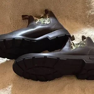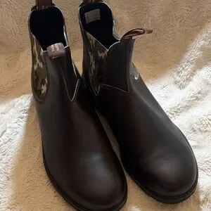Dark brown leather with camouflage accents. Durable and stylish for any occasion, these Australian Blundstone boots are in near perfect condition. Mens size 12.