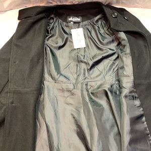 MSquared- This elegant women's coat is a classic wardrobe staple, featuring a stylish double-breasted design and a chic stand-up collar. The tailored, fitted waist flares out into an attractive A-line or "swing" silhouette, which is both flattering and sophisticated. It includes button details on the cuffs and practical slant pockets. Made from a durable material, likely a wool blend or faux wool, it provides warmth and a polished look for winter wear. This versatile coat transitions seamlessly from professional office attire to a formal evening out. NWT