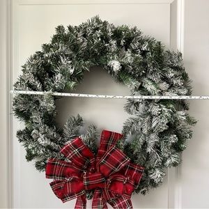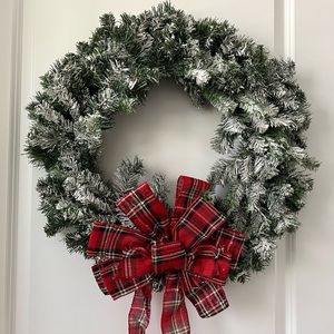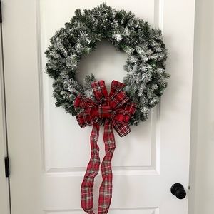Holiday Christmas Snow Flocked Wreath With Tartan Red Plaid Bow