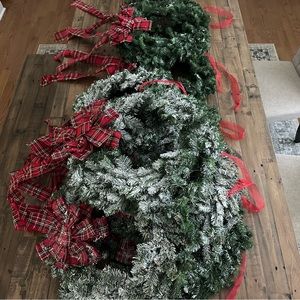 Listing is for 1 wreath, 4 available. Slight variations throughout each wreath and ribbon. Flocking will shed. Single red ribbon tied at top for hanging from windows or can be looped to hang on door. Wreath #3 & #4 are more heavily flocked but have discoloration to flocking material.