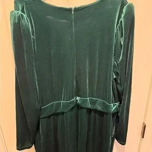 Chic long sleeve dress with a deep V-neck. Rich green velvet fabric. Ideal for elegant occasions.