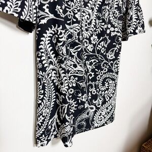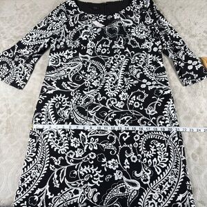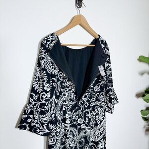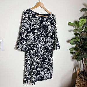 Black white paisley sheath dress Talbots petite size 12P bell sleeve work career office party classic timeless business casual professional holiday party dress Christmas outfit New Years Eve dress winter events festive elegant