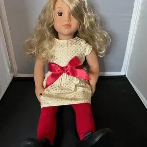 Charming blonde doll dressed in a cream dress with a striking red bow. Perfect for imaginative play. She is in preloved condition